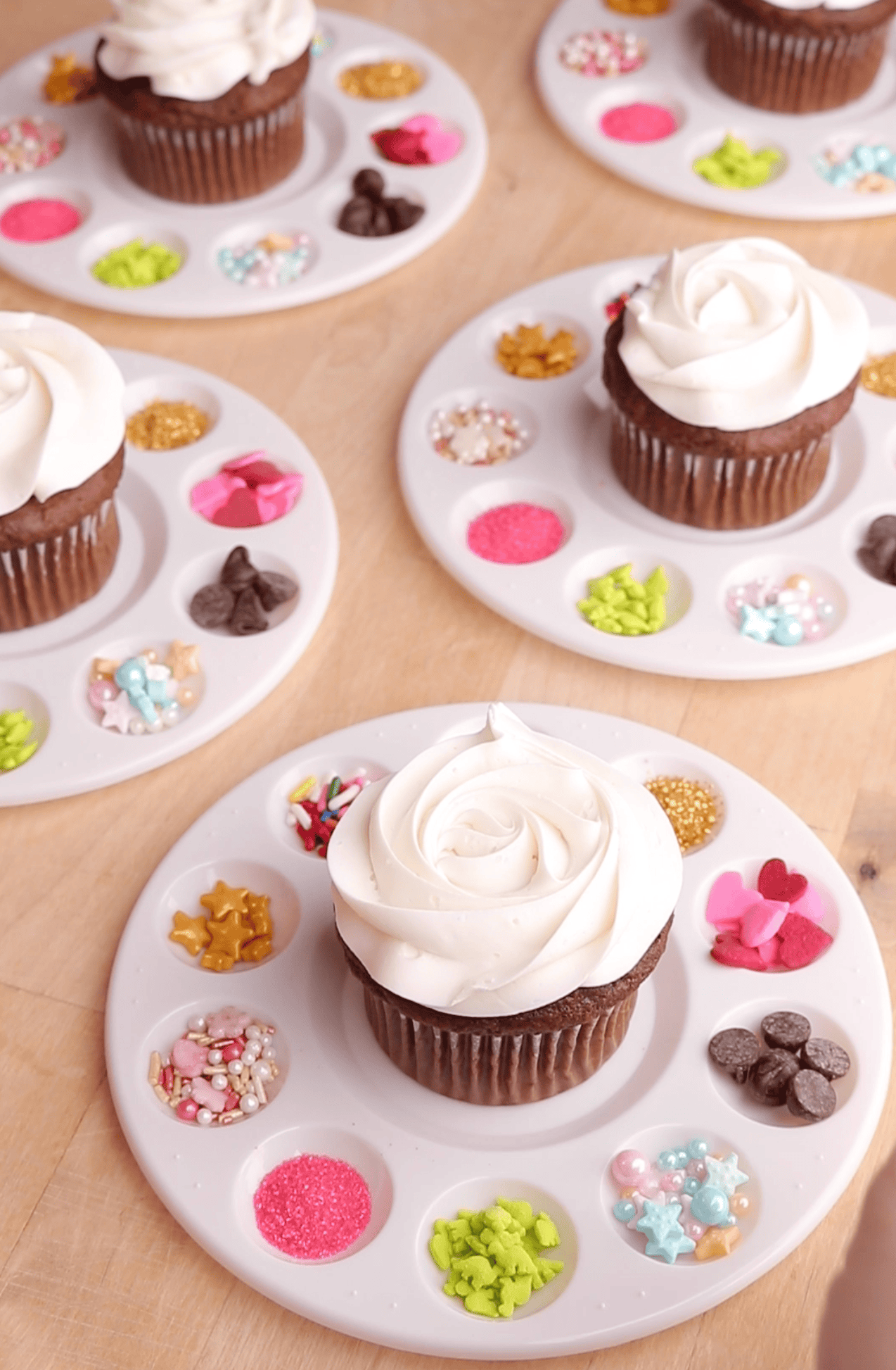 Each child gets their own "decorating station" with a cupcake in the center and a fun variety of toppings in the outer wells. It keeps the mess contained and adds an artistic twist to the party, just like painting, but with frosting and sprinkles!