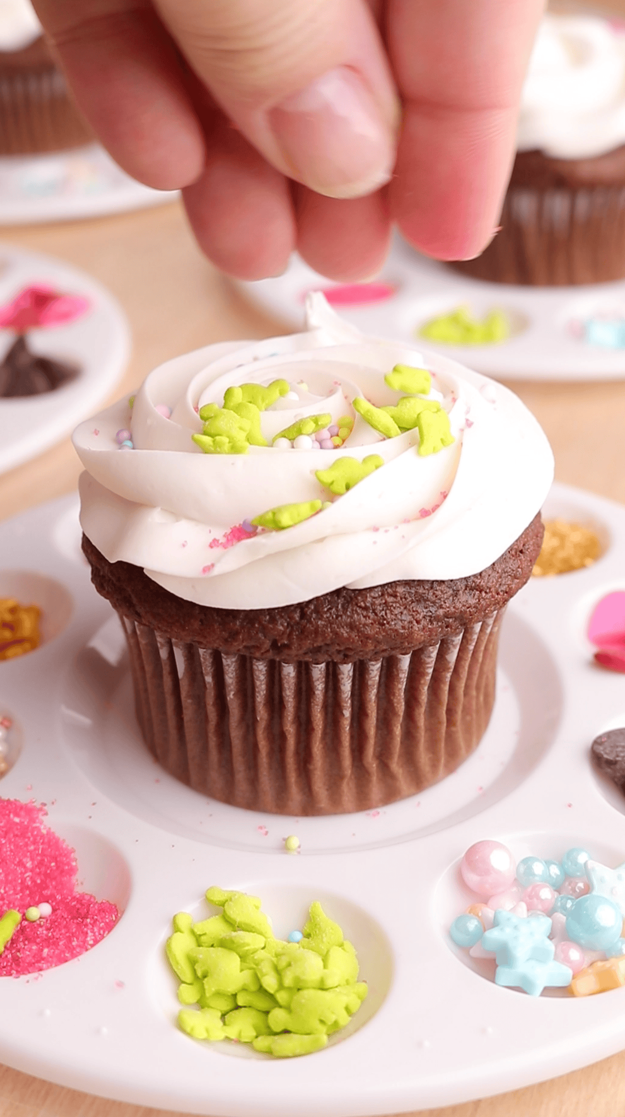 Set up a frosting station with different colors or flavors of frosting in piping bags, or let kids spread it on with spatulas. Optionally you can have the cupcakes frosted but make sure they are not set so the sprinkles stay on!