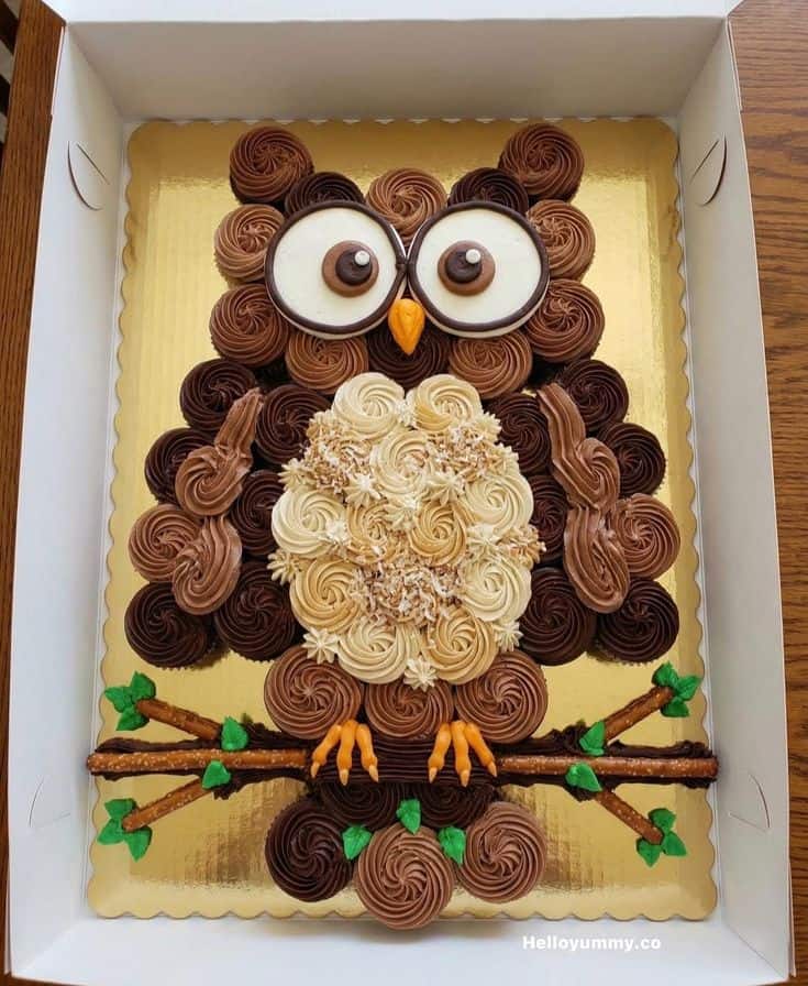 This owl pull-apart cake features swirled cupcakes in warm browns and creams to shape the body, with oversized candy eyes and a bright beak for personality. Pretzel branches, piped wings, and little details bring this cozy woodland friend to life.