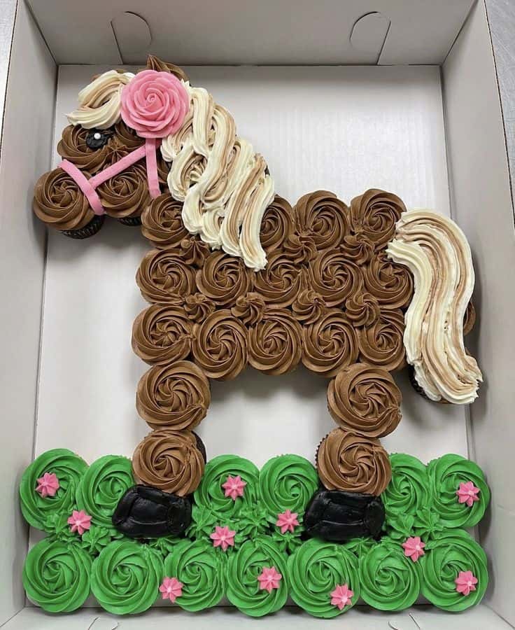 Arrange chocolate-frosted cupcakes in the shape of a horse, then pipe swirled frosting to define the body, legs, and head. Add lighter frosting for the mane and tail, green cupcakes for grass, and finish with small details like eyes, hooves, and flowers.