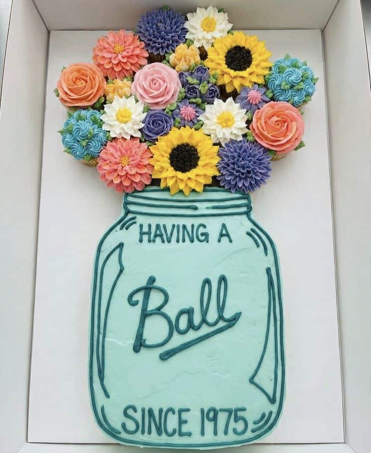 This mason jar cupcake cake features piped buttercream flowers blooming out of the top, with colorful rosettes and florals creating a fresh-picked bouquet look. A smooth frosted jar base with simple piping details ties it all together for a charming, country-inspired dessert.