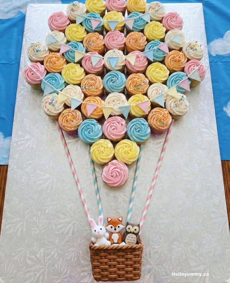 A hot air balloon cupcake pull-apart cake is an imaginative and charming dessert that consists of cupcakes arranged to form the shape of a hot air balloon in flight. Each cupcake is skillfully decorated with colorful frosting and edible details, while the base represents the fondant basket with cute animal fondant friends! Use colorful straws for the hot air balloon "ropes."