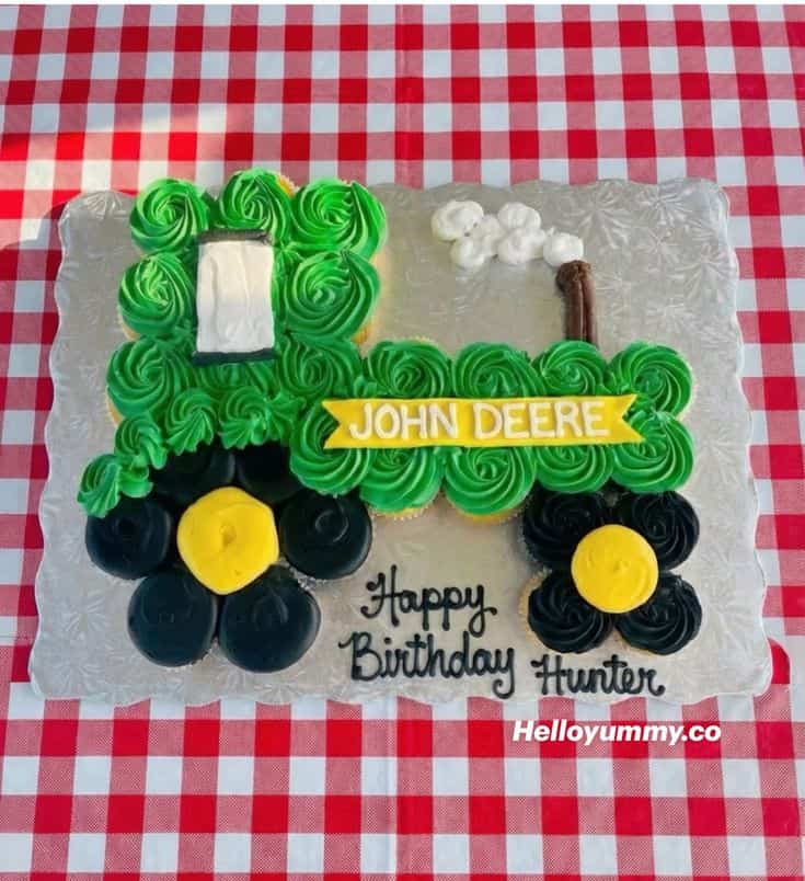 This tractor pull-apart cake comes together with green-frosted cupcakes forming the body, black and yellow wheels for classic farm flair, and simple piped details to bring it to life. Finish it off with a sweet message and a little “exhaust smoke” for a cake that’s perfect for any tractor-loving kid.