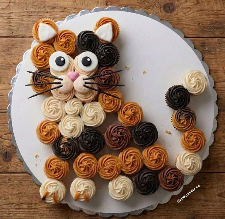 Turn cupcakes into an adorable kitty by frosting them in warm browns and creams, then shaping them into a playful cat pose. Finish with fondant eyes, a pink nose, and simple chocolate whiskers to give this sweet feline tons of personality.