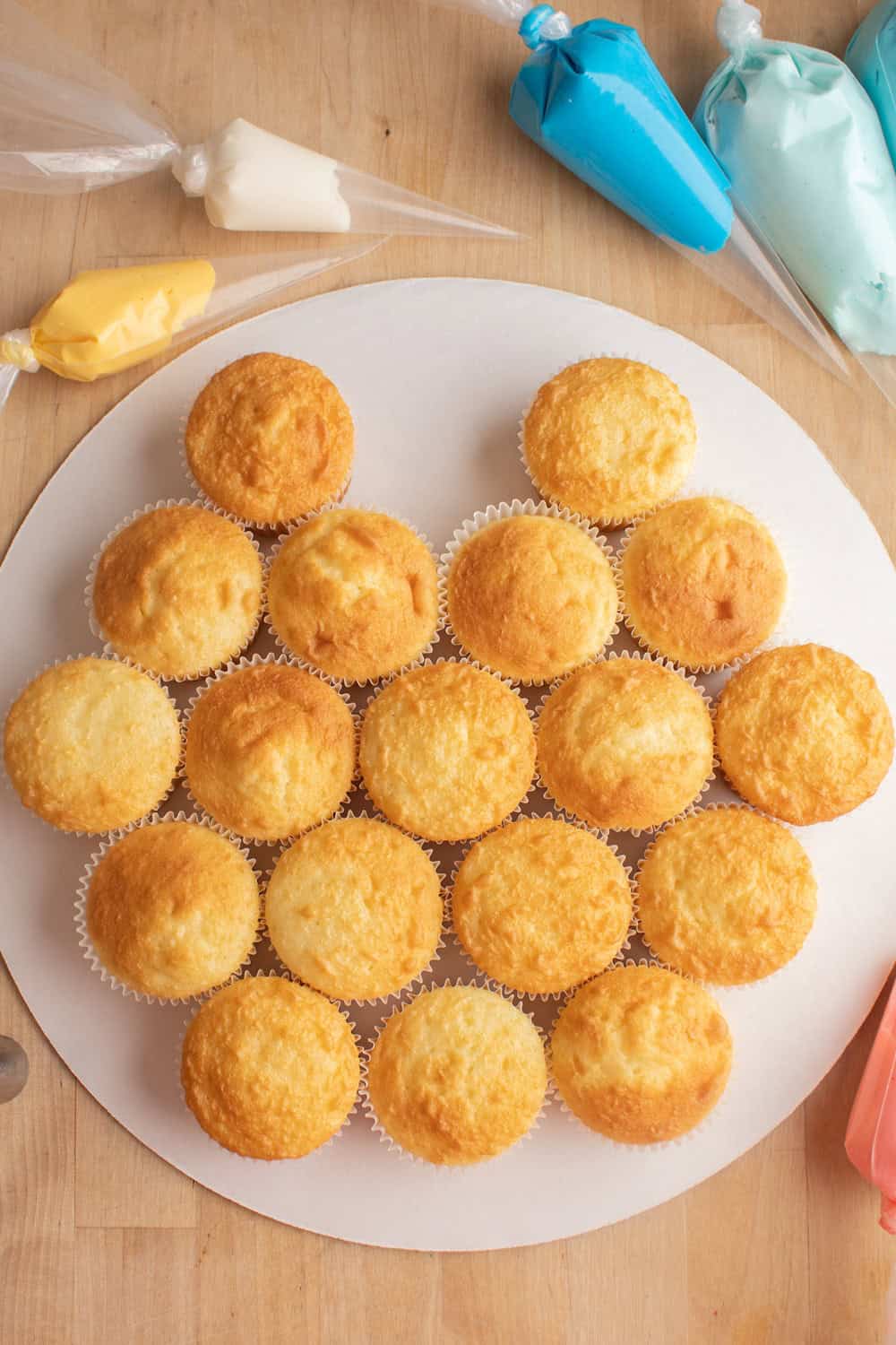 Bake 18 cupcakes using your favorite recipe or mix, then let them cool completely before decorating.