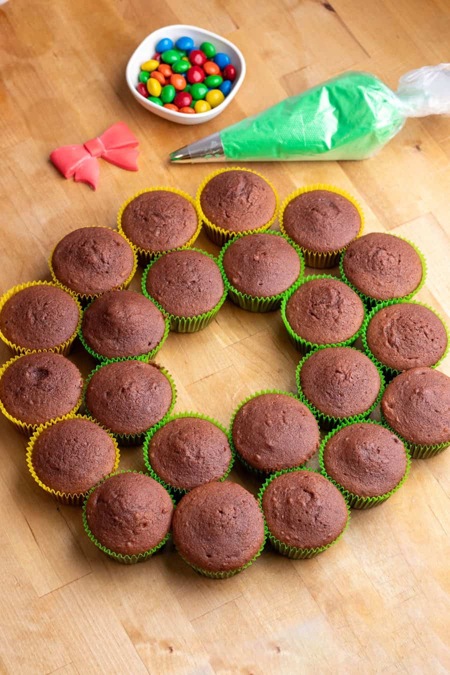 Once cooled, shape your cupcakes into a wreath shape.